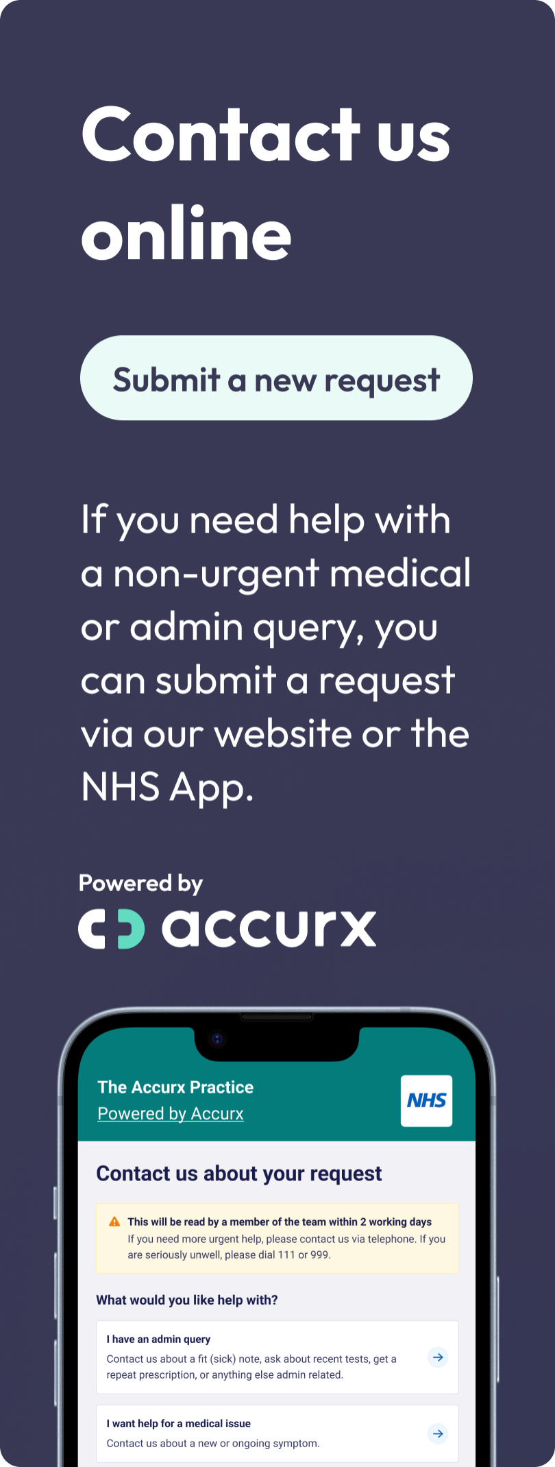 In the case of urgent need when the practice is closed you can call NHS 111 on 111 to speak to a triage nurse. Your needs will be assessed and advice offered or arrangements made for you to see a doctor.